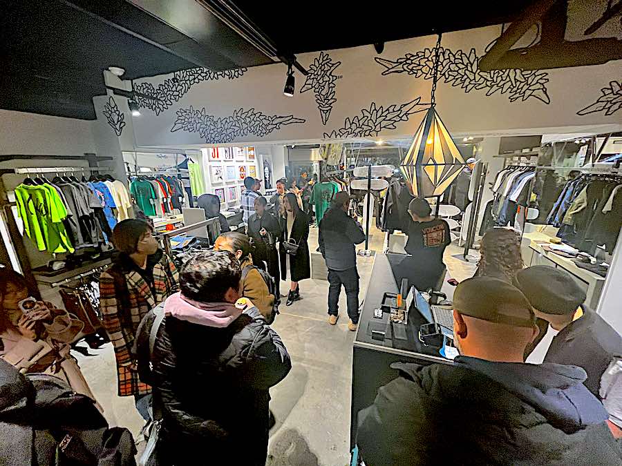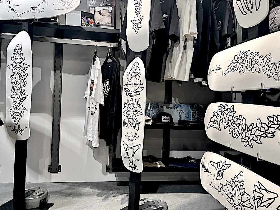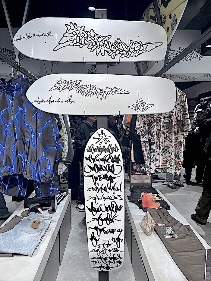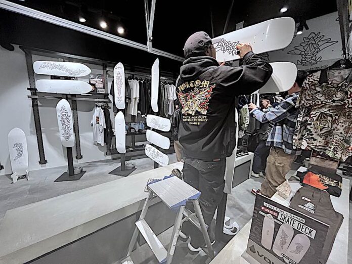 店内には、限定50本の無地のVOLCOMスケートデッキひとつ一つにアートを施していくsense氏の姿を見ようと、多くの人たちが押し寄せ、イベント終了の20:00まで大盛り上がりとなった。
