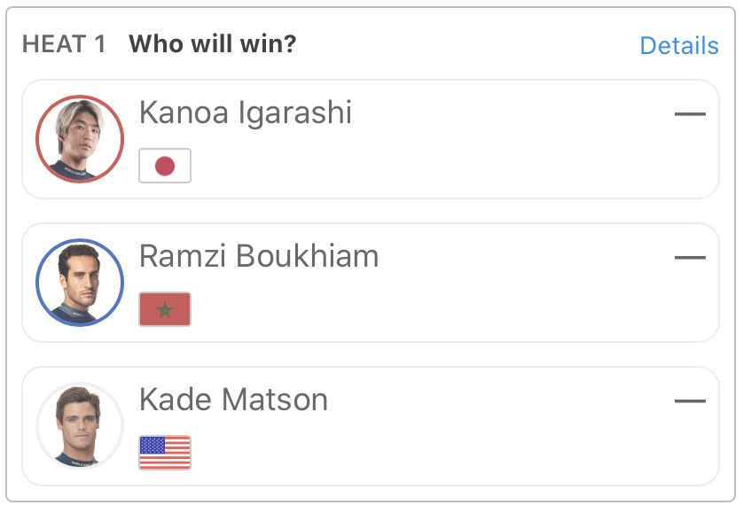 注目の日本人選手は五十嵐カノアはヒート1でRamzi Boukhiam、Kade Matsonと対戦。