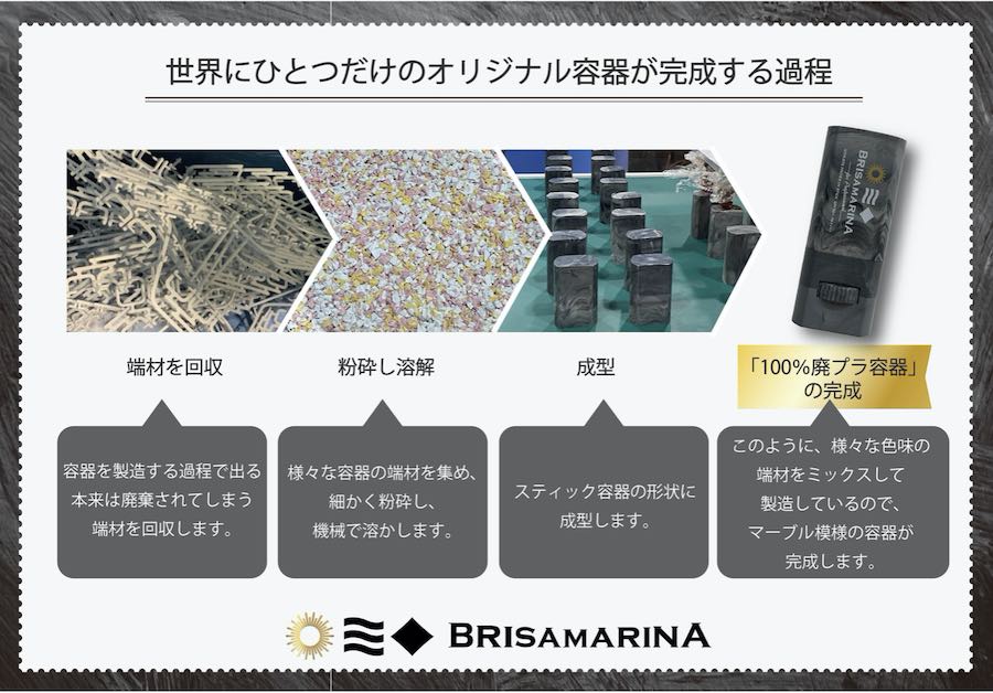 さらなる環境への配慮に踏み出した今回のアップサイクル100%廃プラ容器の採用により、容器ひとつ一つに色ムラや柄の違いが生じ、同じものがふたつとない自然界と同様の魅力的な味わいをプロダクト自体に目に見える形としてに落とし込んだ。