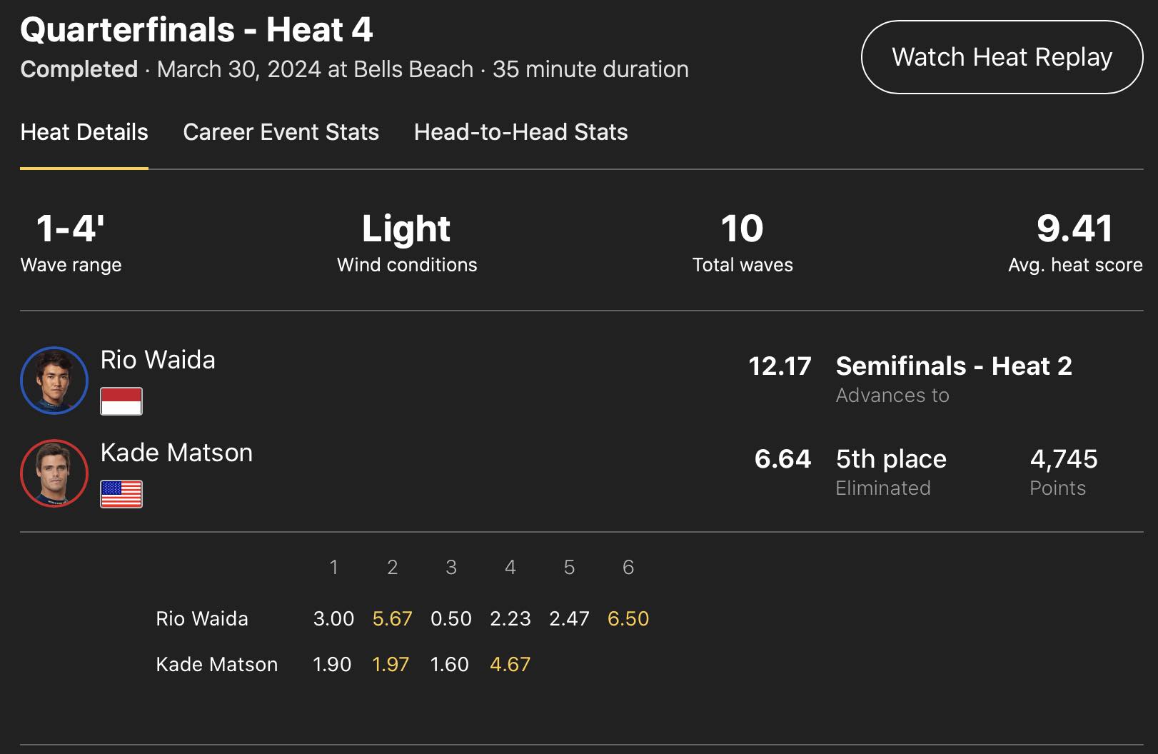 注目の和井田理央は、クォーターファイナルのヒート4でKade Matsonと対戦。