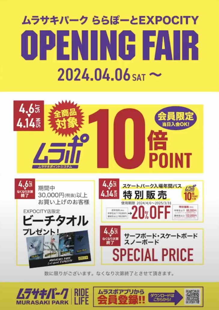また、ムラサキパーク ららぽーとEXPOグランドオープンとなる4/6(土)は、ムラポ10倍やスケートパーク年間パス20%オフ特別価格販売などを含めたオープニングキャンペーンに加え、スケートパーク内で白井空良、玉井辰磨、西矢椛、織田夢海、中山楓奈、上村葵といったムラサキスポーツのトップガールズ・スケートボーダーたちによるデモンストレーションなども開催!