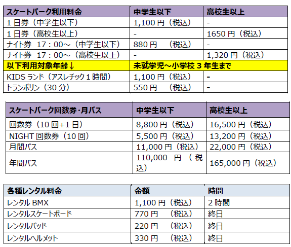 設備: 屋内スケートパーク(冷暖房完備、2Fフラットエリア)、KIDSアスレチック&トランポリンエリア