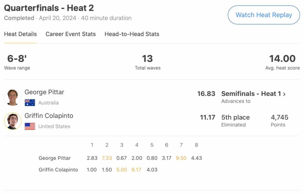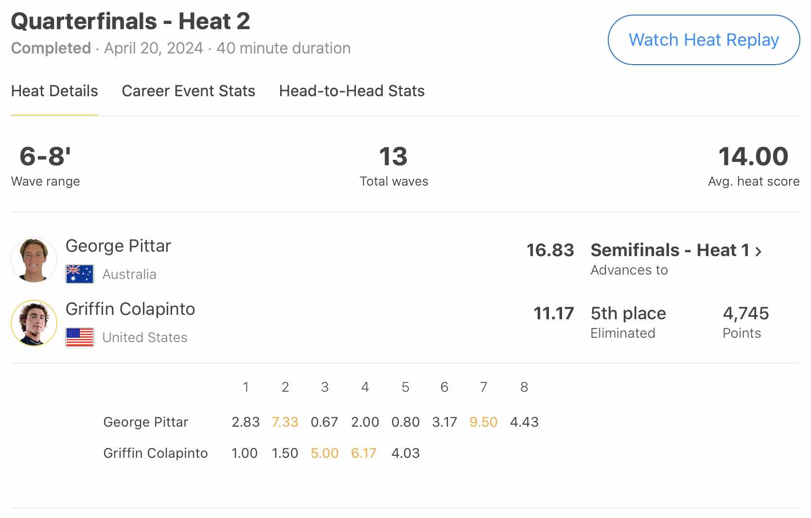 今大会にワイルドカードで出場を果たしたGeorge PitterがクォーターファイナルでCTランキング1位のGriffin Colapintoに勝利する快挙を挙げたことはこの日の中でも特筆すべき出来事。