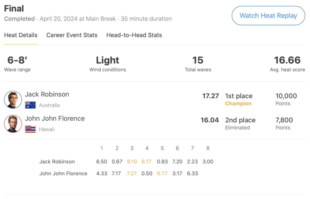 パーフェクト10ptでJohn John Florenceがその勢いのまま優勝をさらうかと思われた中、Jack Robinsonは3本目の波でビッグカーヴを3発決めて9.10ptを叩き出すと、さらに4本目にはフロントサイドのビッグエアを決めて8.17ptと2本のエクセレント・スコアをマーク!