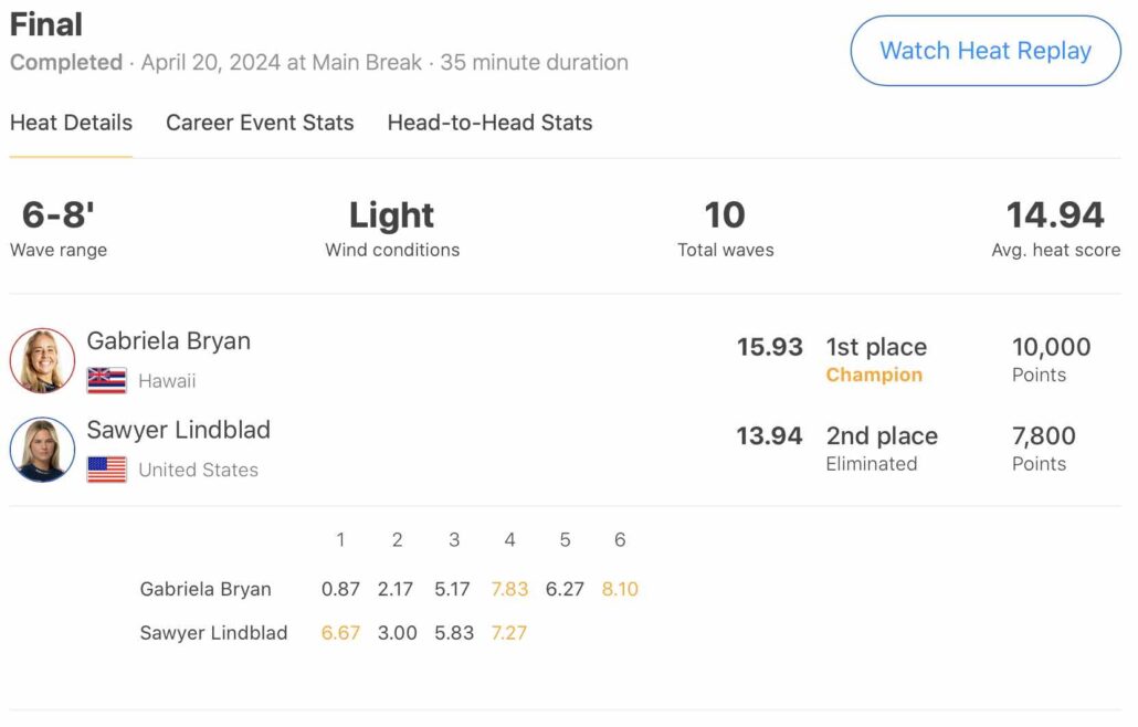 ミッドシーズンカットのギリギリラインであるWOMENS CTランキング10位のポジションで今大会に挑んだGabriela Bryanは、ファイナルでルーキーのSawyer Lindbladと対戦。