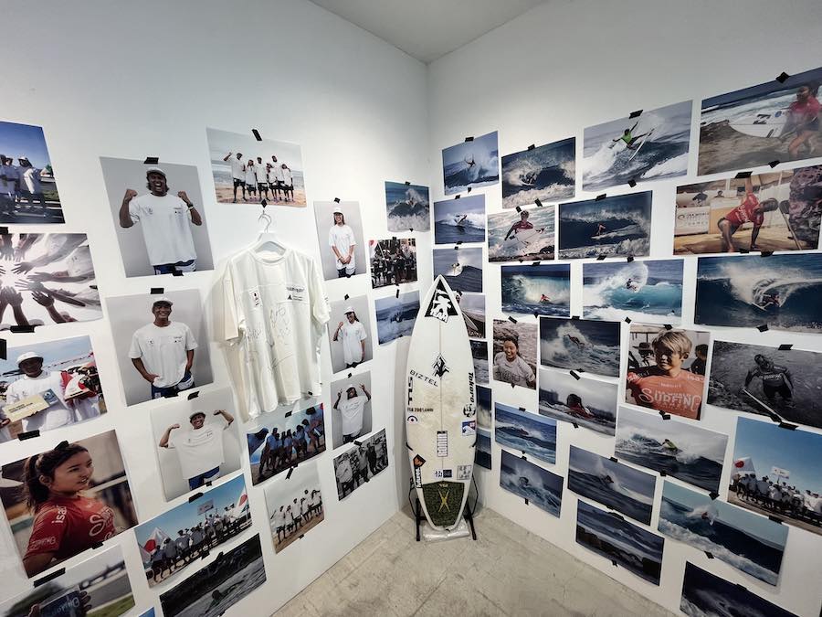 当日の会場には、五十嵐カノア、稲葉玲王、Connor O’Leary、都筑有夢路、前田マヒナ、松田詩野といった今年のISAワールド・サーフィン・チャンピオンシップの日本代表チーム波乗りジャパンメンバーたちの写真や使用ボードなどが展示され、オフィシャルユニフォームの先行販売も行なわれた。
