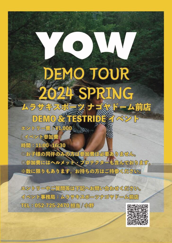 独自に開発したMerakiトラックにより、サーフィンやスノーボードでしか体感し得なかったカーヴィングの感覚を陸上で再現し、その限りなくリアルな乗り味から一気に世界中で爆発的ヒットとなったサーフスケートYOW surfが、ゴールデンウィーク中の5/2(木)にムラサキパークEXPOCITY店にて、5/3(金)にムラサキスポーツ・ナゴヤドーム前店にて”YOW DEMO TOUR”を開催することが決定!