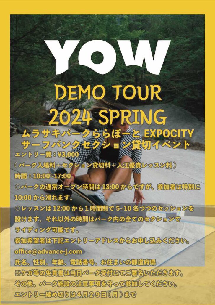 エントリー費:¥3,000(パーク入場料+YOWデモボード試乗+ムラサキパーク内サーフスケートバンク・セクション貸切料+入江優貴レッスン料)
