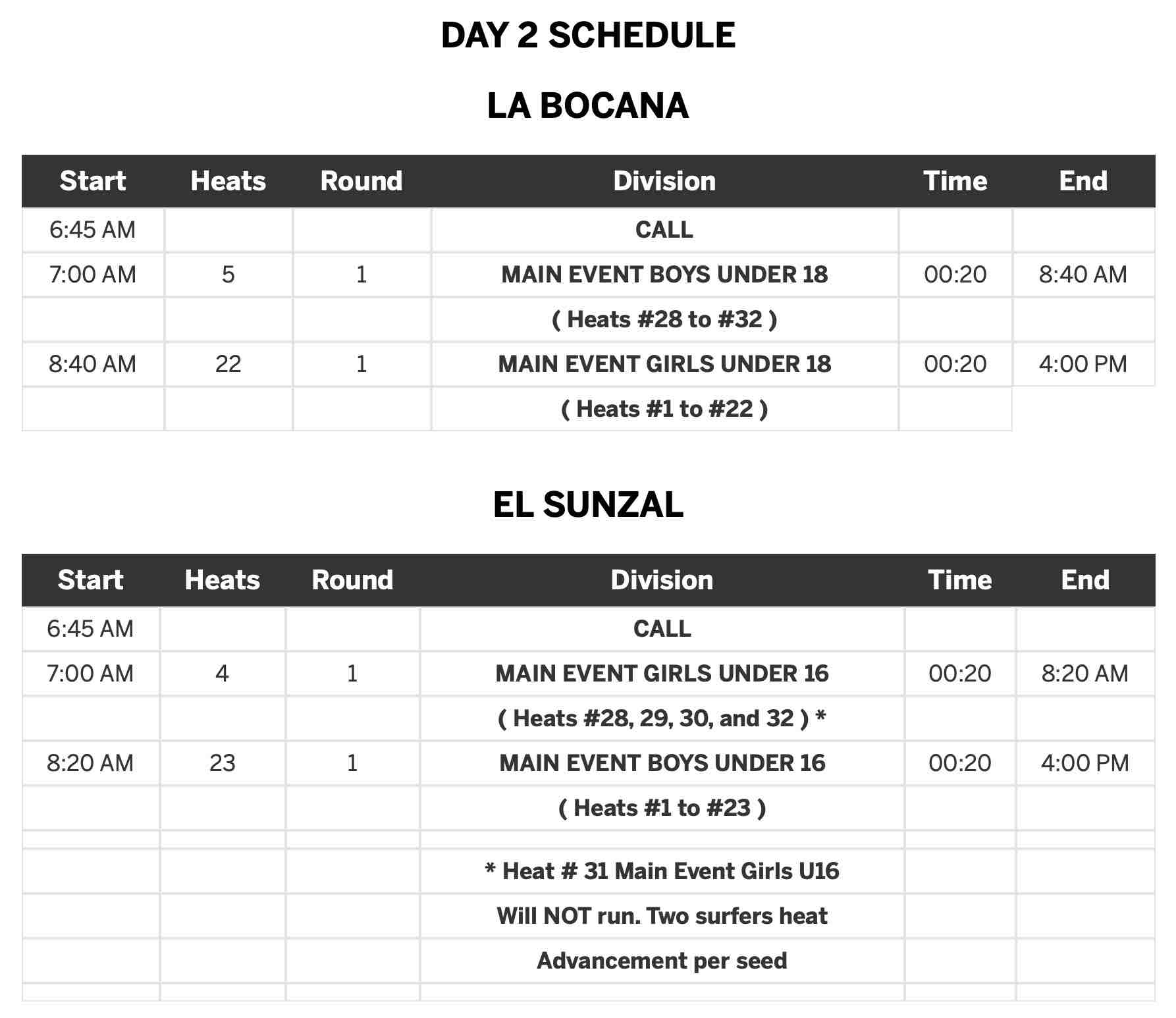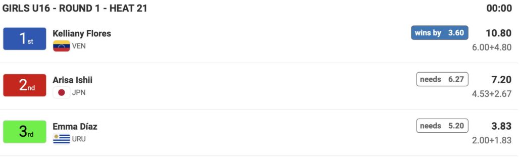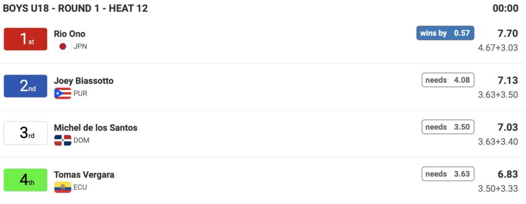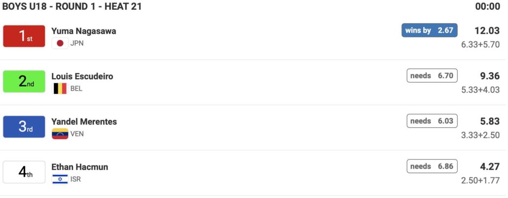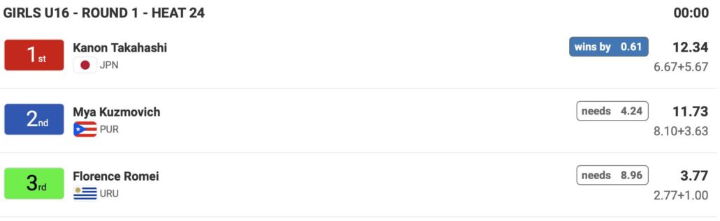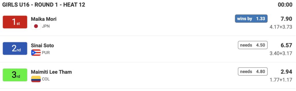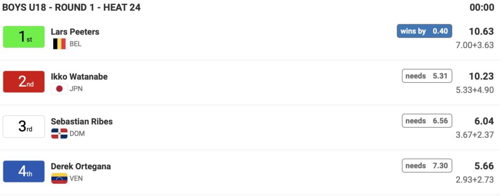 日本時間の5/5(日)21:00前後からスタート予定のDAY2には、ポディウム1で男子18歳以下の残りのヒートを消化後に女子18歳以下Girls U-18のメインラウンド1のヒート22までを、ポディウム2では女子16歳以下Girls U-16のメインラウンドの残りのヒートが終了後、男子16歳以下Boys U-16のメインラウンド1のヒート23までが行なわれる予定となっている。