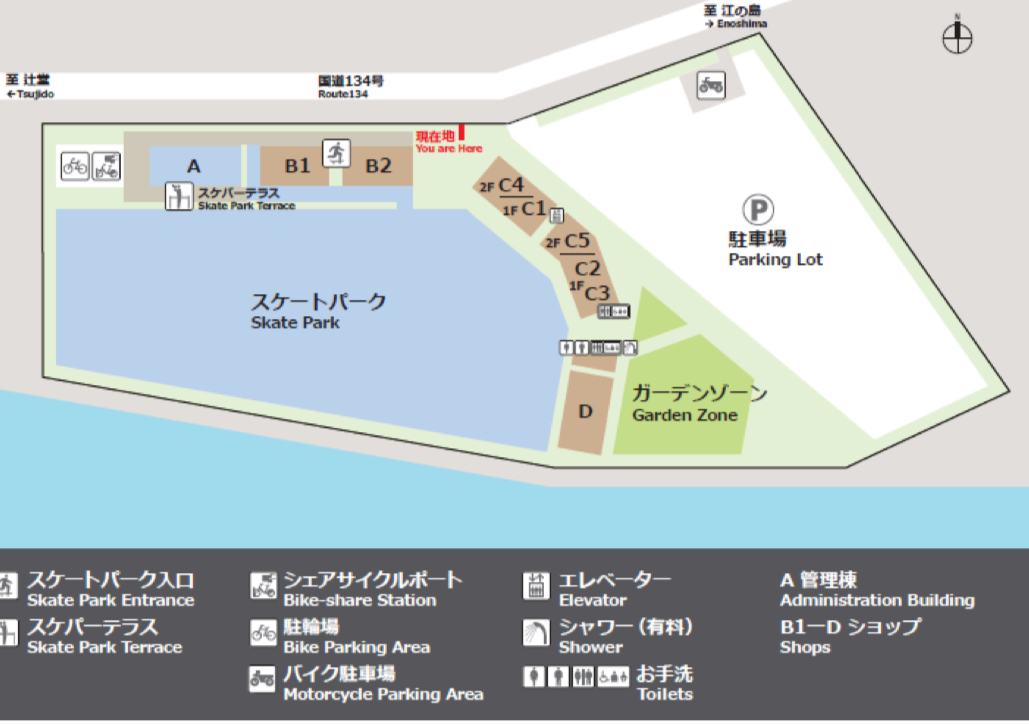 湘南なぎさパークが整備し、園内に店舗も出店するムラサキスポーツが管理するスケートパーク(有料)の区画は、パークエリア、ビギナーエリア、ストリートエリア、ランプエリア、BMXエリアで構成。パークエリアは、トップレベルの競技会にも対応するコンビプールを中心に、入門レベル向けのミニボウル、サーフィンのようなライディングが楽しめるサーフスケートゾーンなどを設け、幅広いレベルのスケーターやライダー、サーファーにお楽しみいただける設計となっている。また、スケートパーク外のテラスやデッキでは、シーサイドビューをバックにプレイヤーの躍動する姿をどなたにも観覧することができる。