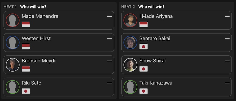 MENS、WOMENSのQS1000″Krui Pro Junior”のセミファイナルのヒート表は下記の通り。
