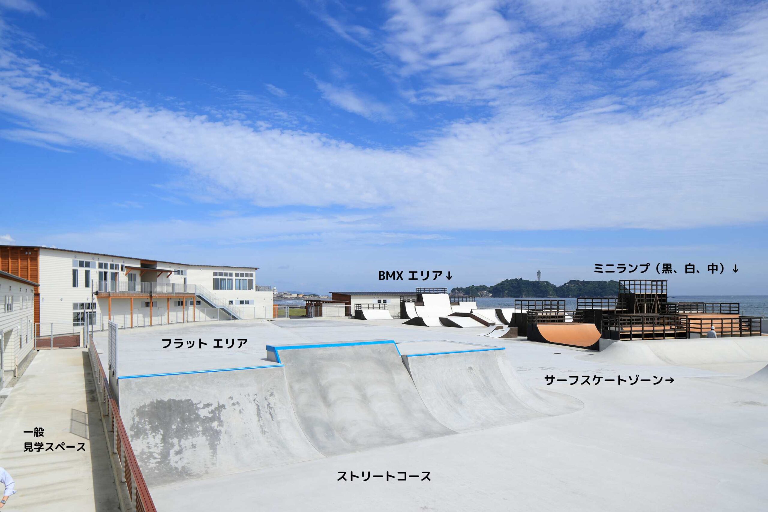 フラット、BMXコース、ミニランプ(黒、白、中)、サーフスケートZONE、スネークZONE、2018年のCOMBI POOL、ボール、ストリートコース の構成になっている。スケートボード、BMX、インラインスケートでの仕様が可能。初心者からトップアスリートまで楽しめるように、各セクションが設計されている。