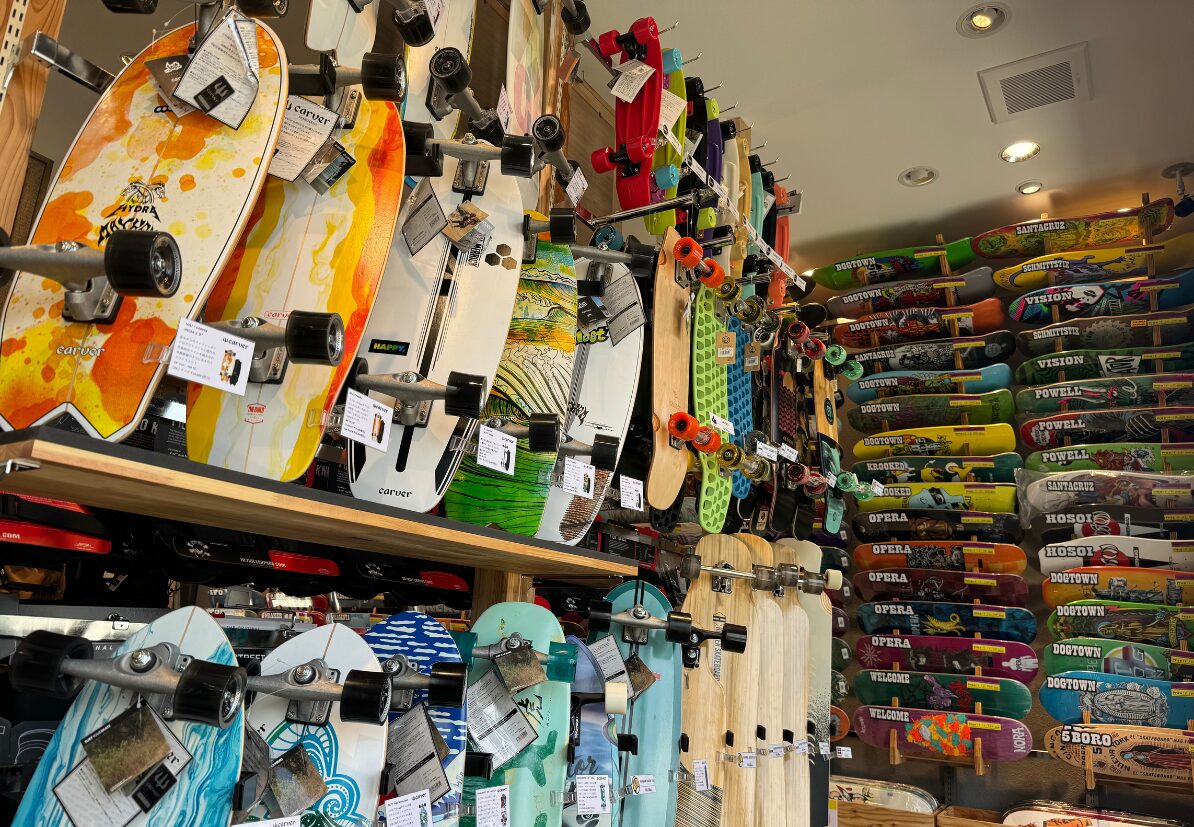 ムラサキパーク鵠沼海浜公園店内、サーフスケートの品揃え日本NO.1 !