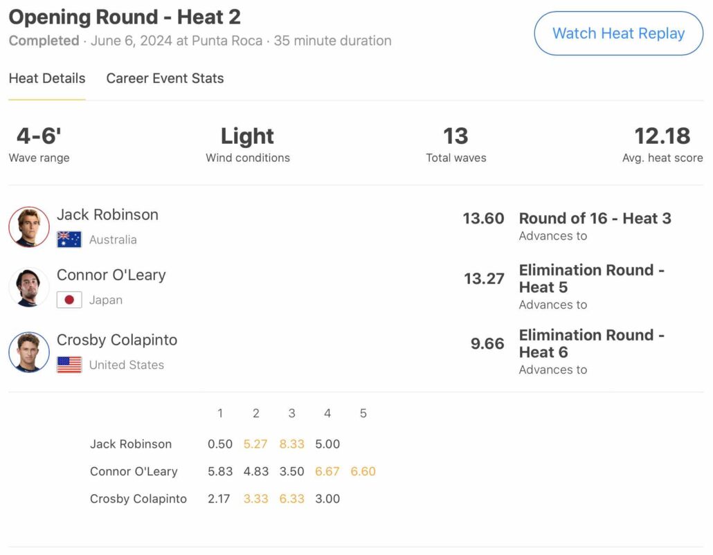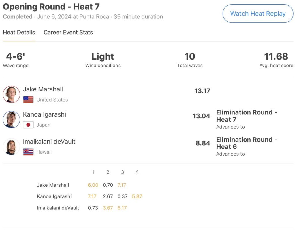 注目の日本人選手たちの活躍は、五十嵐カノア、Connor O’Leary、和井田理央の3名共にイリミネーション・ラウンドへ進出。
