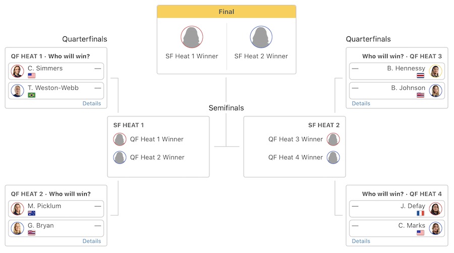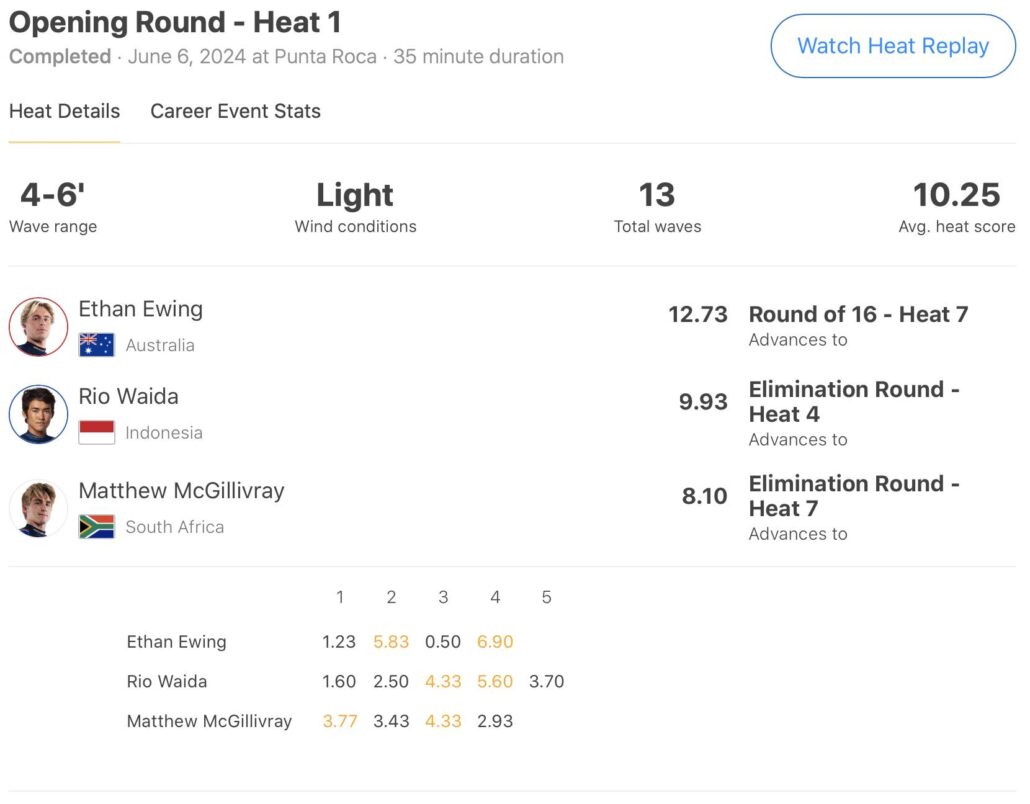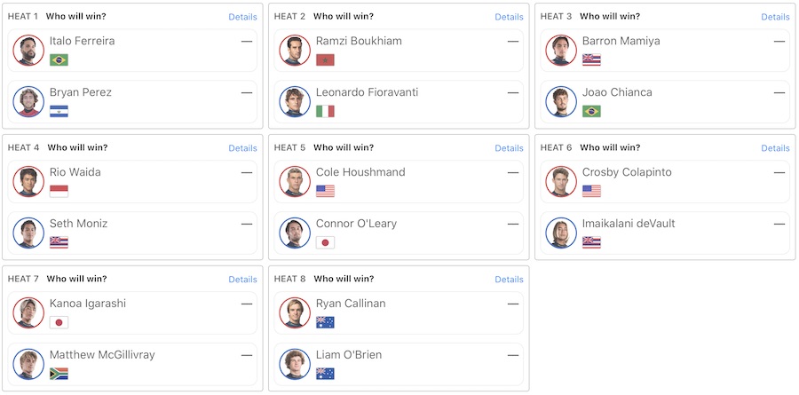 和井田理央がヒート4でSeth Moniz、Connor O’Learyがヒート5でCole Houshmand、五十嵐カノアがヒート7でMatthew McGillivrayと対戦予定となっている。