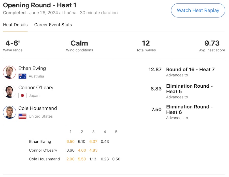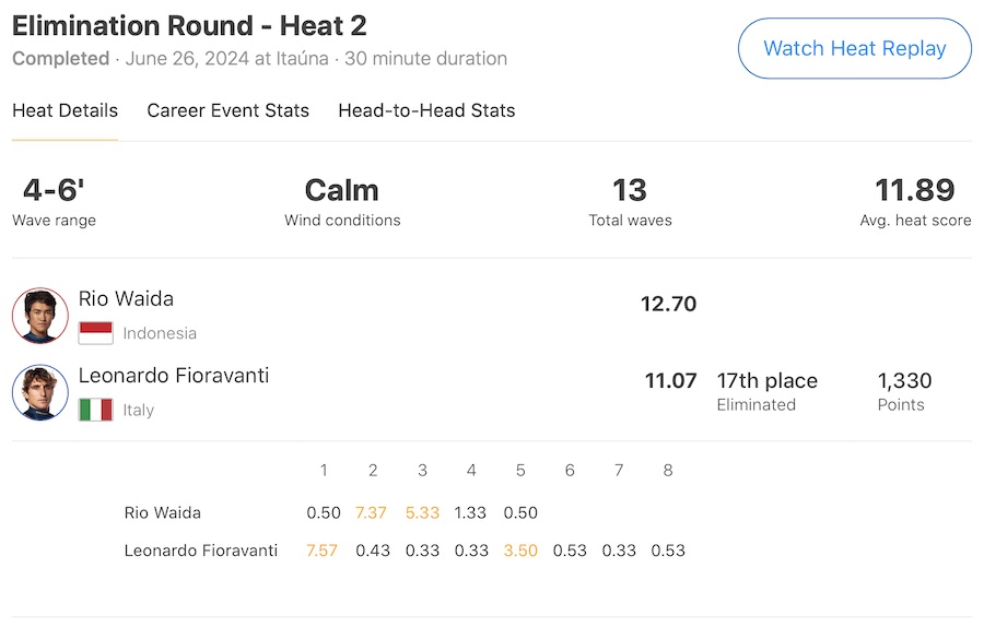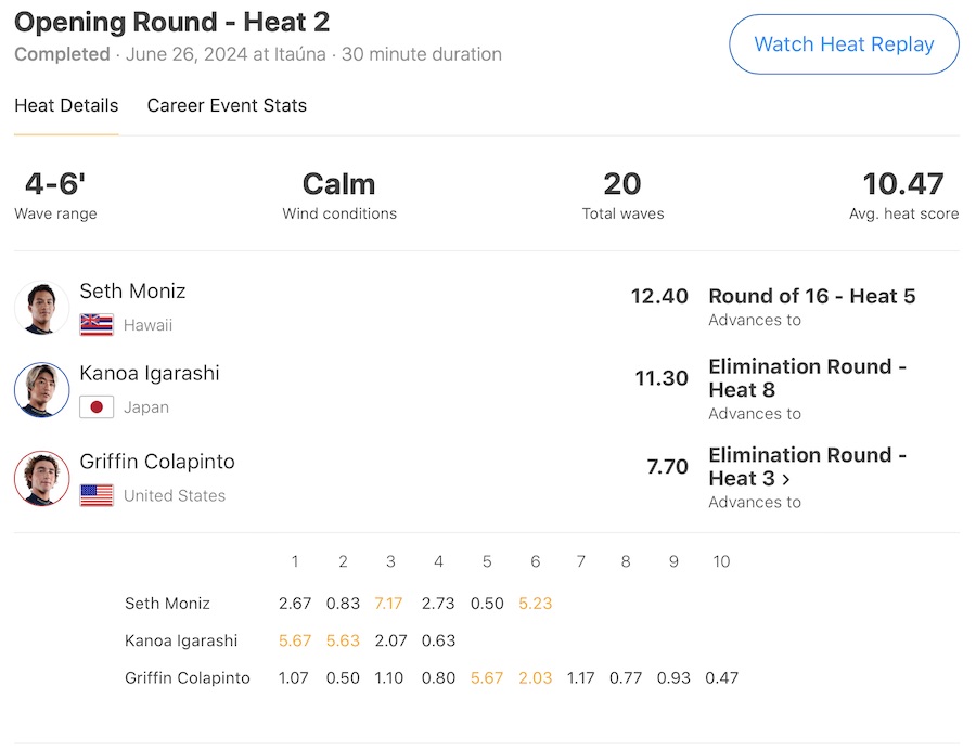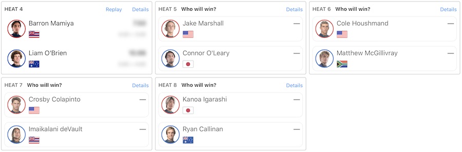 ヒート8では五十嵐カノアがRyan Callinanと対戦予定となっている。