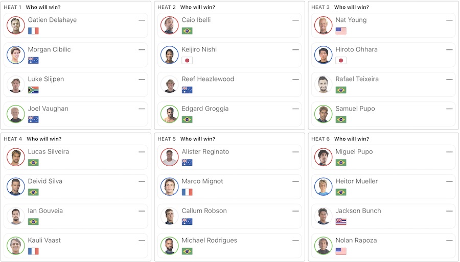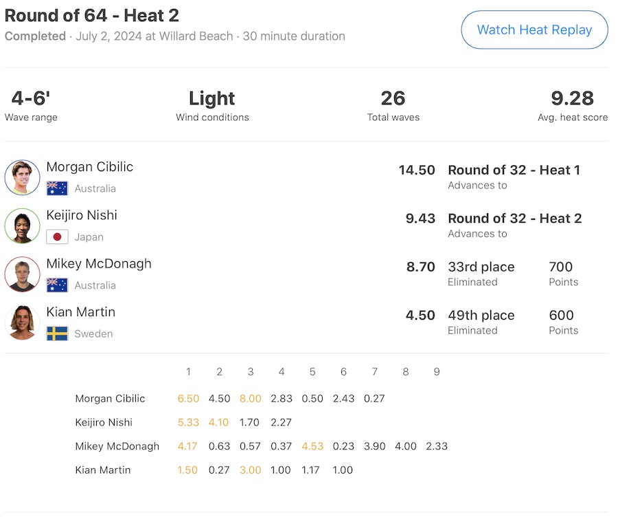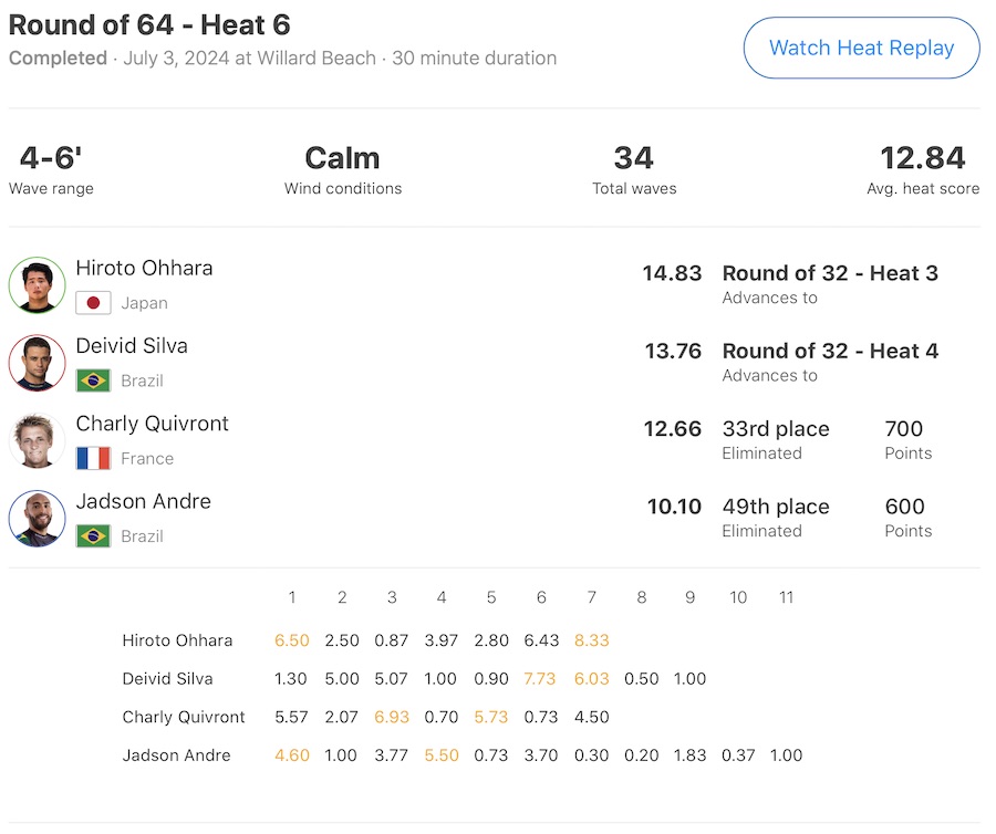 注目の日本人選手たちの活躍は、ヒート2で元CTサーファーのMorgan Cibilicに次ぐ2位のポジションをキープした西慶司郎と、ヒート6でパワフルな2ターンで8.33ptのエクセレントスコアで現時点での今大会におけるベスト・シングルスコアをマークし、CTサーファーDaivid SilvaとJadson Andreを相手に大逆転1位を果たした大原洋人がラウンドオブ32進出!