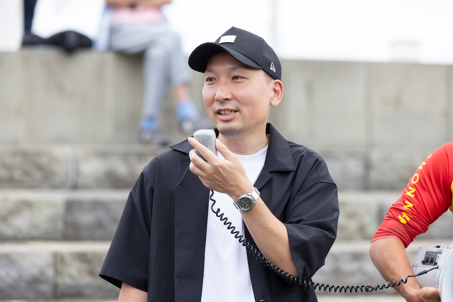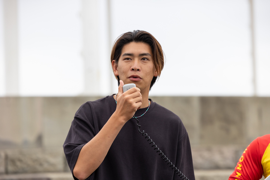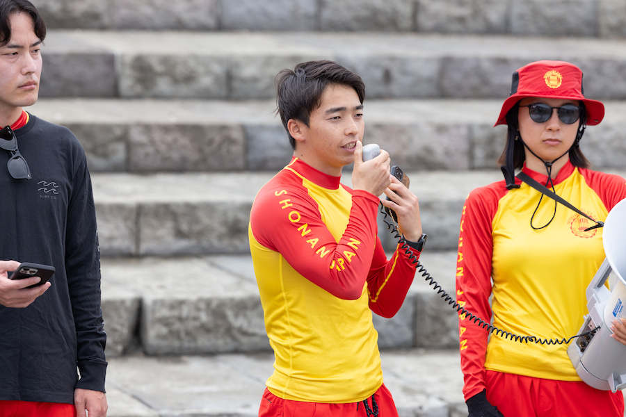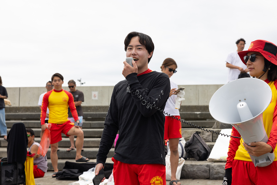 西浜SLSCのパトロール委員会副委員長、坂本真徳さん。「江の島海水浴場協同組合の協力もあり、遊泳エリアの目安となる白杭が40mほど江ノ島側に移動してサーフィンエリアが広がりました。サーフィンスクールゾーンのエリアもありますので、みなさんと情報共有しながら夏を一緒に楽しんでいきましょう」