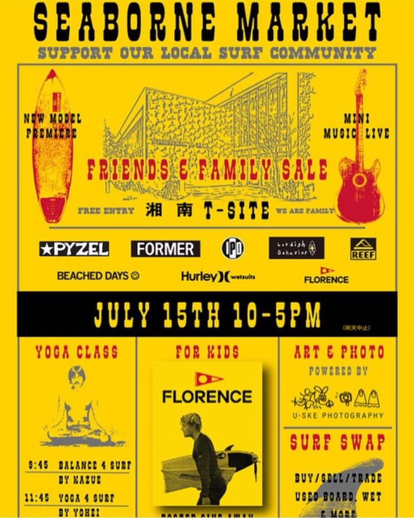 また、来たる7/15(月・祝)、Tサイト湘南にてFLORENCE MARINE Xをはじめ、”PYZEL surfboards、Hurley wetsuits、IPD、REEF、大橋海人のLordish Behaivior、U-skee PhotoといったJohn John Florenceにゆかりのあるブランドが一堂に会する”FLORENCE presents Seaborne Market in 湘南Tサイト”が開催予定!