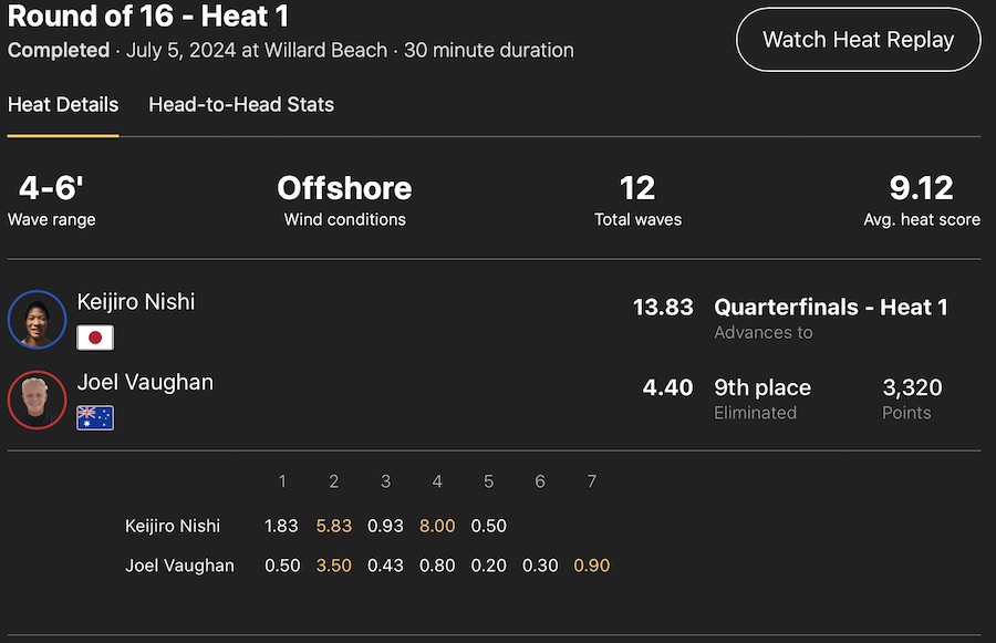 注目の日本人選手たちの活躍は、ヒート1でJoel Vaughanを相手に8.00ptのエクセレントスコアを叩き出した西慶司郎とヒート4でCTサーファーDeivid Silvaを粉砕した大原洋人が見事クォーターファイナル進出を決めた!