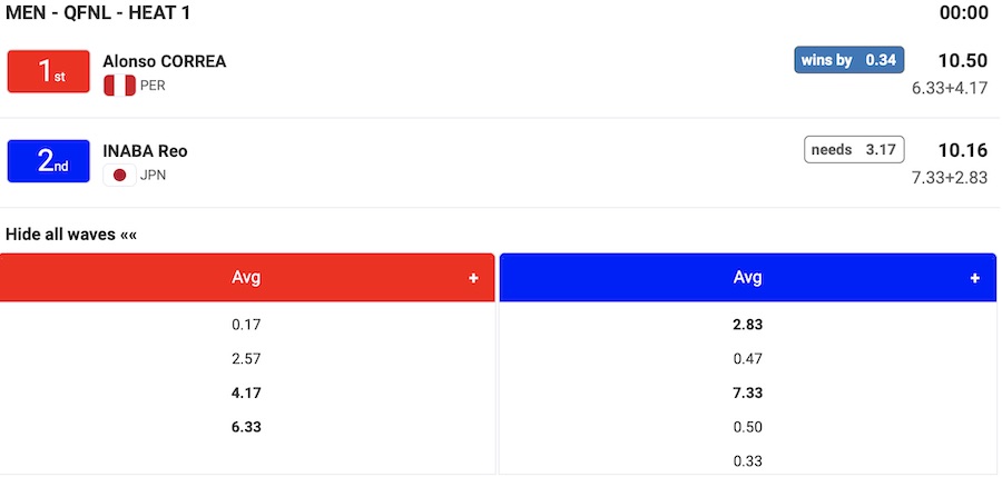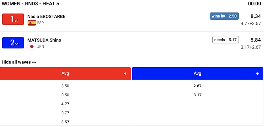 注目の日本代表選手の活躍は松田詩野がWOMENSラウンド3のヒート5でスペイン代表のNadia Erostarbeに敗退となって9位となり、稲葉玲王がMENSクォーターファイナルのヒート1でペルー代表のAlonso Correaに敗退となり、5位で今大会をフィニッシュすることとなった。