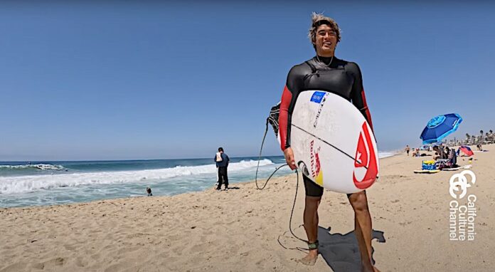 そんな彼が、ホームブレイクであるハンティントンビーチから車で10分程度南下した所に位置するニューポートビーチで、夏のサウススウェルが炸裂した最高の波をスコア!