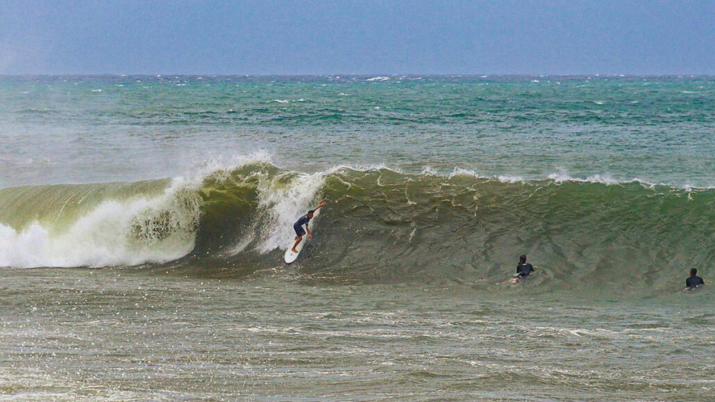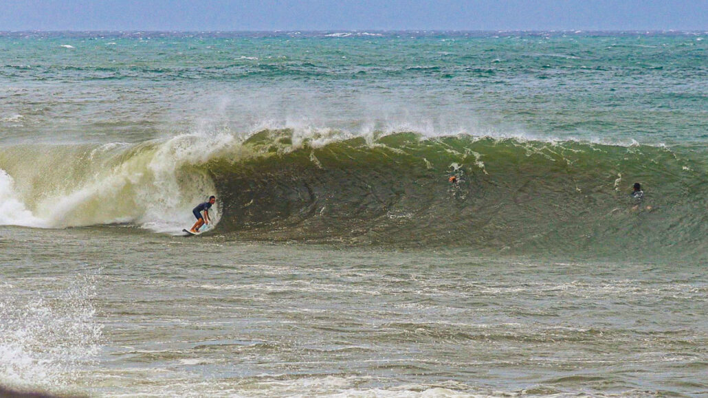 このポイントはリーフブレイクで、岸が非常に近いことからダブル以上はないと逆に危険で、もしボトムで躊躇してチューブにネジ込めずスープの下にポジションしてしまったら、岩だらけの岸辺に打ち上げられる可能性があるエキスパート・オンリーと言って過言ではない場所なのである。