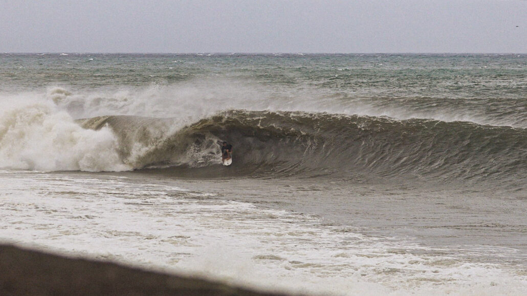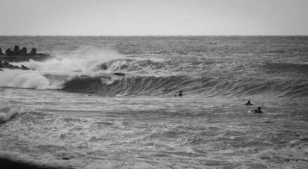 前日の西湘での4×グランドチャンプ浜瀬海とJPSAトップシードの大矢ひいな、期待の中学一年生サーファー高井悠二朗といったレジェンド添田博道氏のバイブスを継承する添田サーフボード・ジャパン・チームたちとのセッションでは、夕方急激にサイズアップしてきたことから、さらに波が上がることを期待して、6年前にcolorsmag的伝説の台風セッションとなる波に遭遇した某所を狙うべく、夜中の3時に脇田泰地と合流し、車を走らせた。
