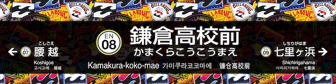 2.鎌倉高校駅の駅名看板やベンチがBILLABONG歴代ロゴの総柄デザインで装飾される。※8/29(木)から10/15(火)まで