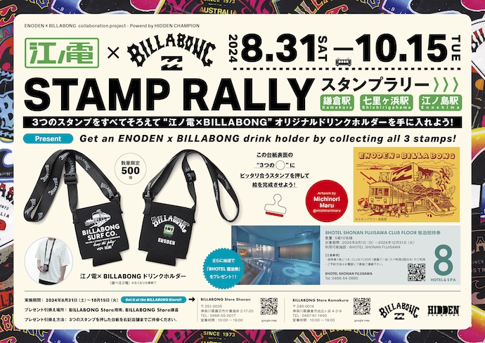 3.先着限定500名様に江ノ電×BILLABONGスペシャル・ドリンクホルダーがプレゼントされるスタンプラリーを開催。鎌倉駅、七里ヶ浜駅、江ノ島駅の3駅に設置されたスタンプを、湘南エリアと親和性の高いアーティスト丸倫徳氏が手掛けたスタンプラリー台紙に押して集める遊び心溢れる移動型コンテンツとなっている。※8/29(木)から10/15(火)まで