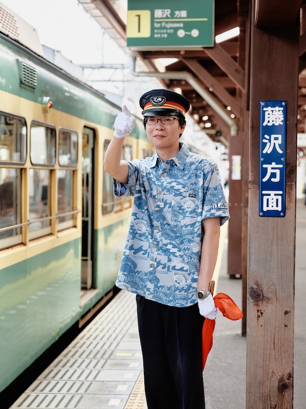 江ノ電駅員と江ノ電売店のスタッフは、1985年に誕生したクレヨン・ウェイブ・ロゴをはじめ、BILLABONGの過去から現在に至るまでのヘリテイジ・ロゴがコラージュされた総柄デザインからなるコラボ制服シャツを着用。胸にはBILLABONGのワッペンが配され、ボタンはココナッツボタンを使用するなど、細部に渡ってこだわりが落とし込まれたアロハシャツ仕様となっており、こちらもまた限定販売アイテム以上に手に入れたくなるファンの心をくすぐる逸品。