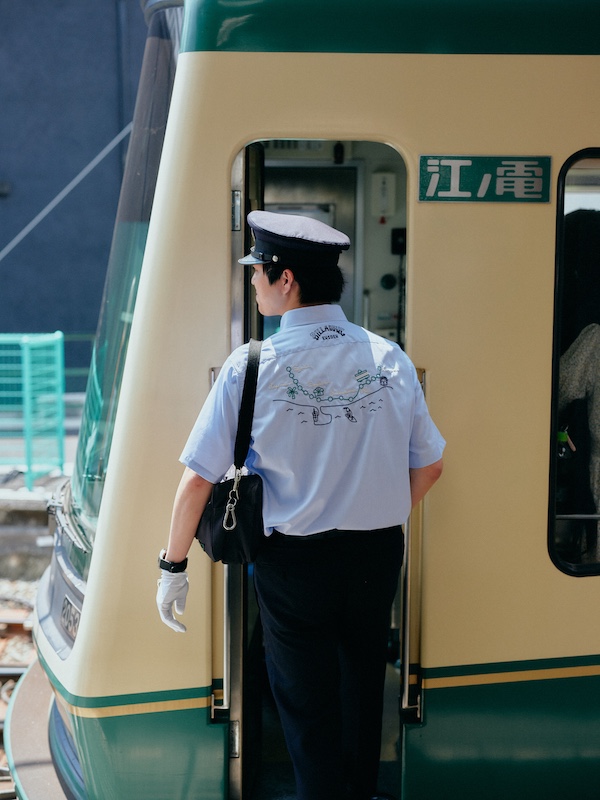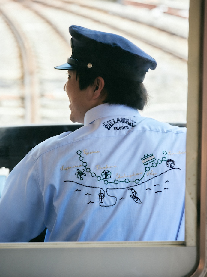 江ノ電の乗務員がコラボ期間中に着用するコラボ制服は、胸に江ノ電とBILLABONGのワッペン、背中にBILLABONGロゴと手書き風の江ノ電路線図が刺繍で施されており、同じ湘南発のブランド”鎌倉シャツ”による吸水性が高く、シワになりにくい防縮性にも優れたハイクオリティーなボディが採用されている。むしろこのシャツが欲しい。