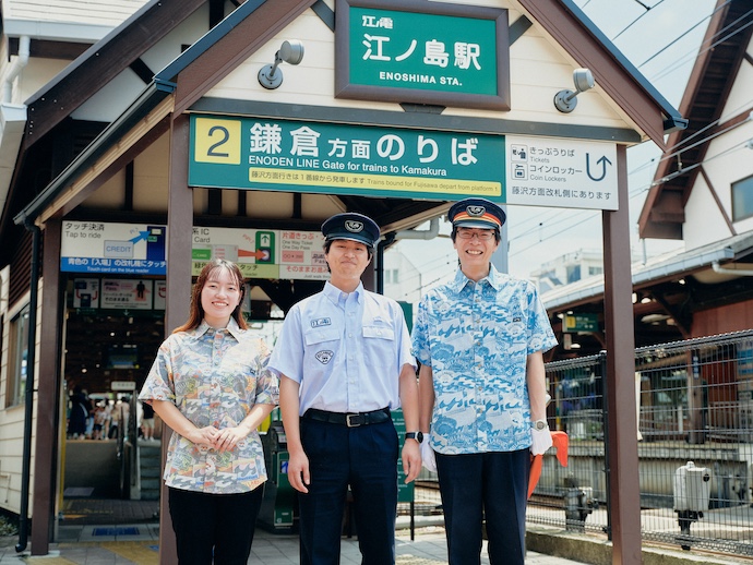 1.江ノ電乗務員は同じ湘南発のブランド”鎌倉シャツ”のボディに胸には江ノ電とBILLABONGのワッペン、背中にはBILLABONGロゴと手書き風の江ノ電路線図が刺繍で施されたコラボ制服シャツを、江ノ電売店スタッフや駅員がBILLABONG歴代ロゴがコラージュされた総柄デザインのシャツを着用する。※8/29(木)から10/31(木)まで
