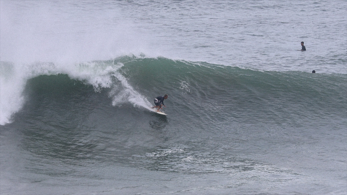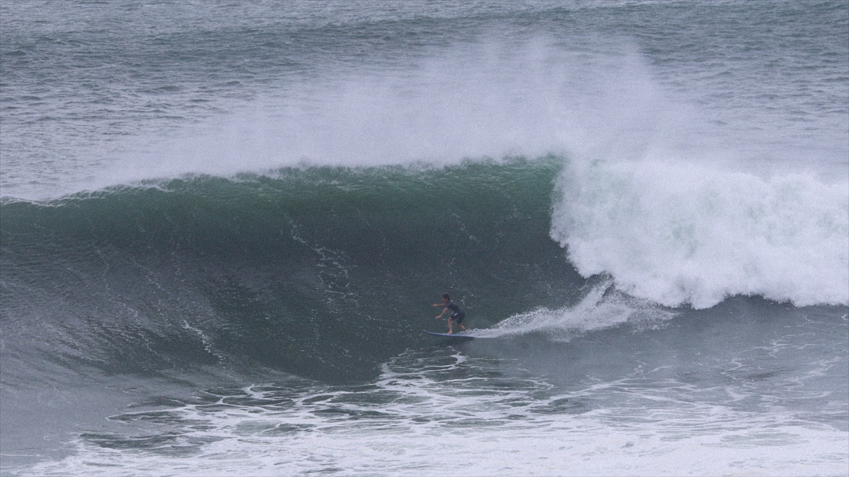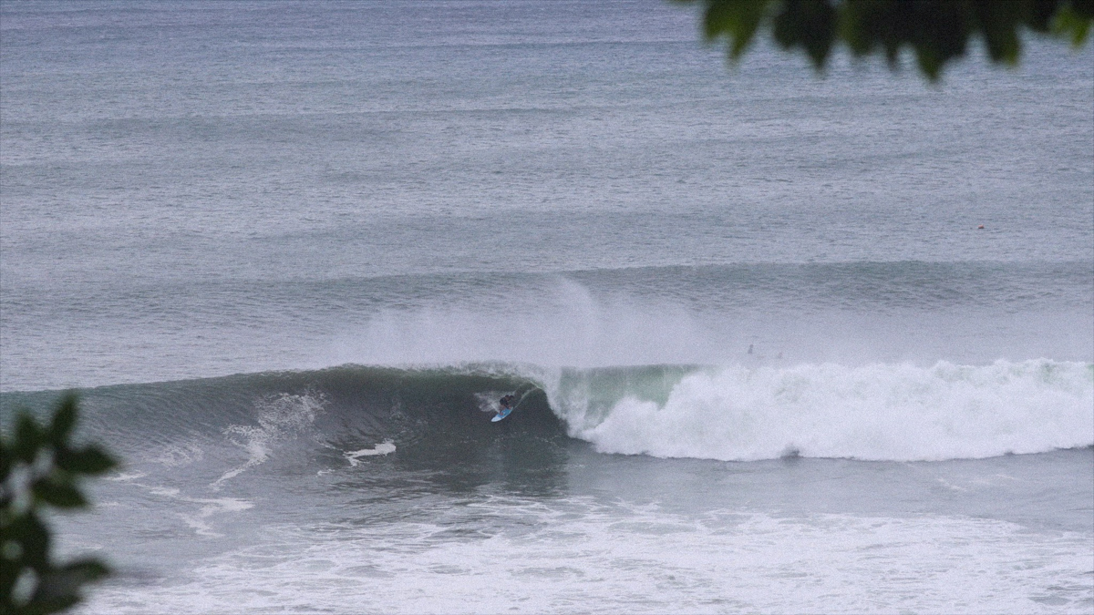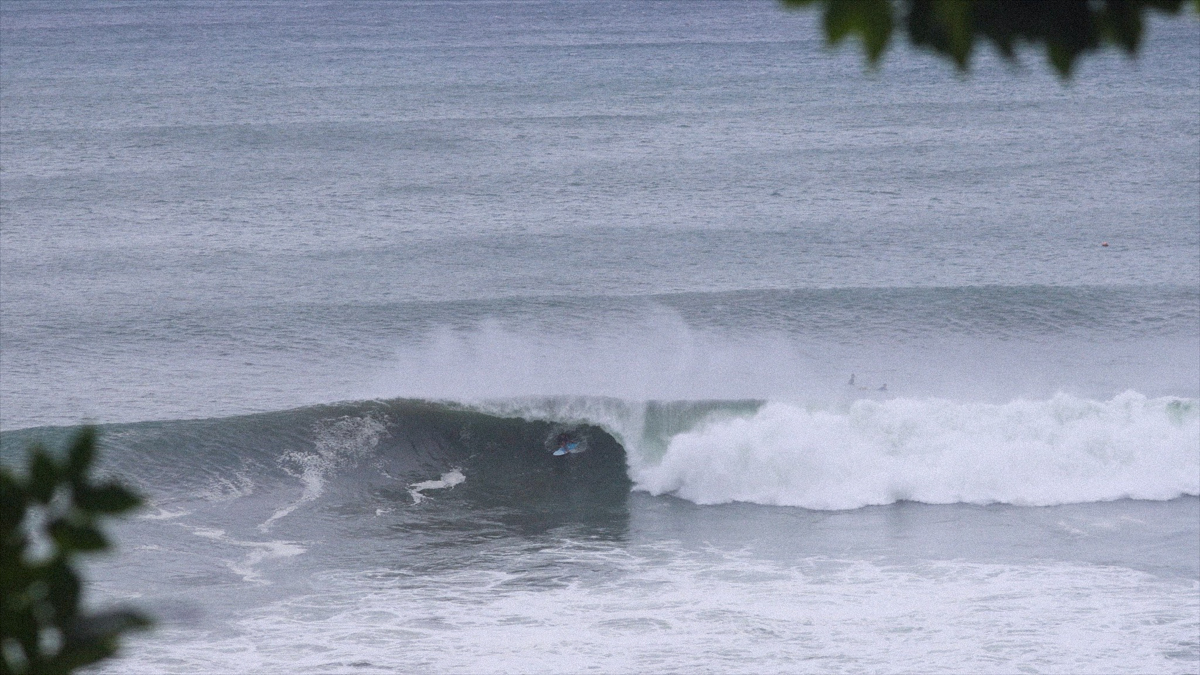 ビッグドロップからフェイド気味に降りると、深いボトムターンでソリッドに切り立つ壁を背に、何を思ったか、バックサイドでチューブにねじ込んでいく。