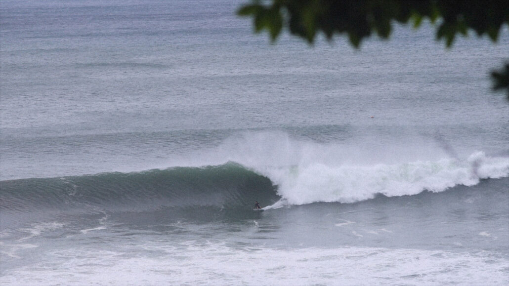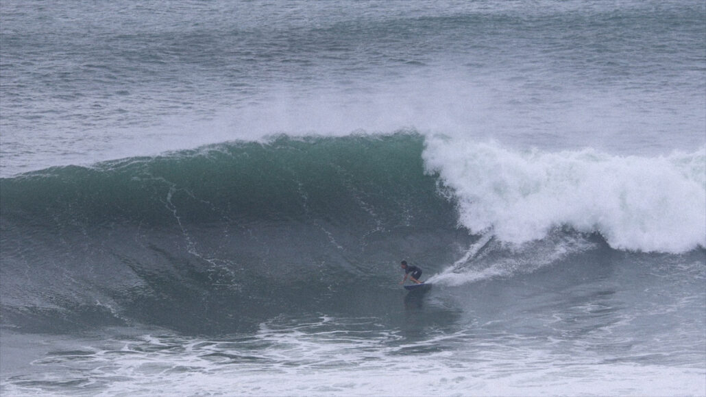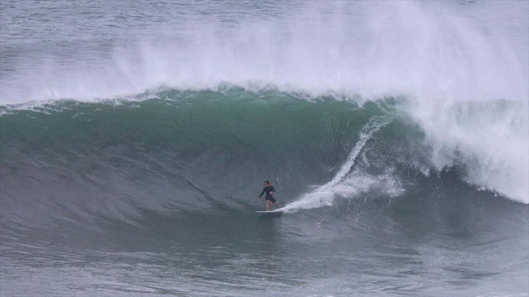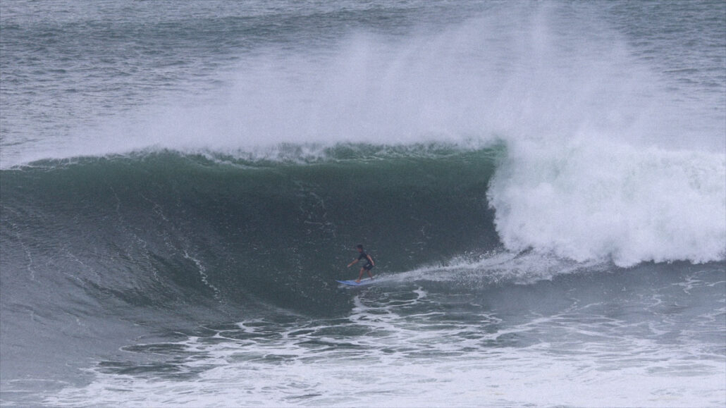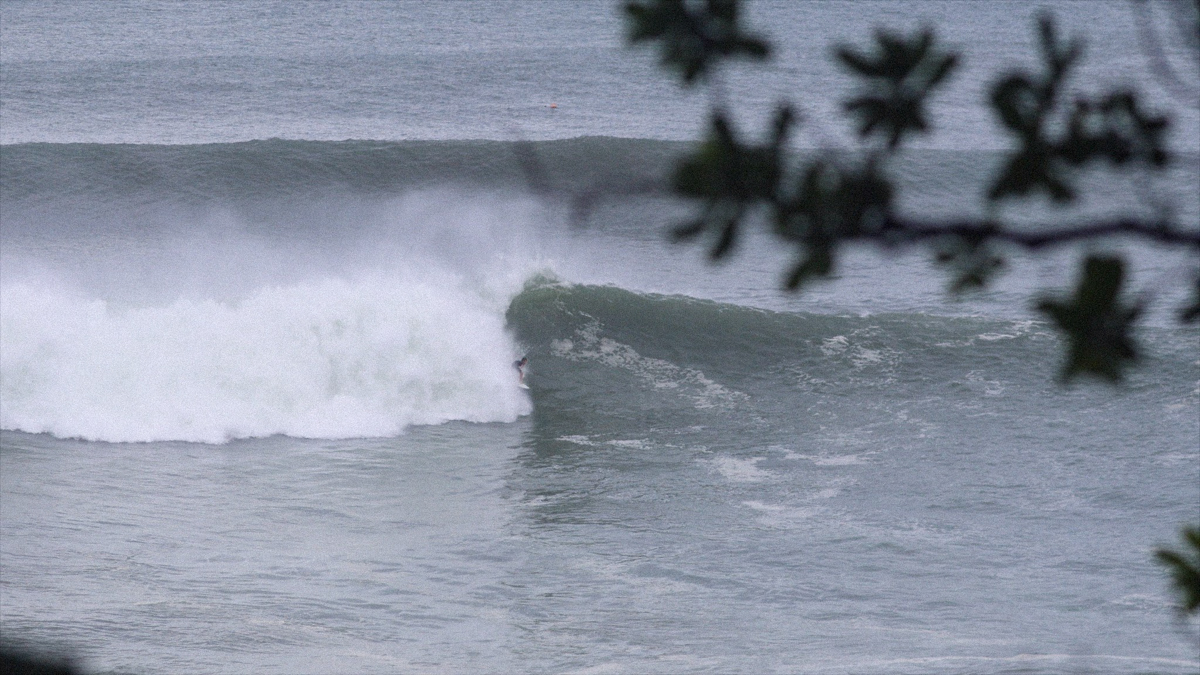 ビッグドロップからフェイド気味に降りると、深いボトムターンでソリッドに切り立つ壁を背に、何を思ったか、バックサイドでチューブにねじ込んでいく。