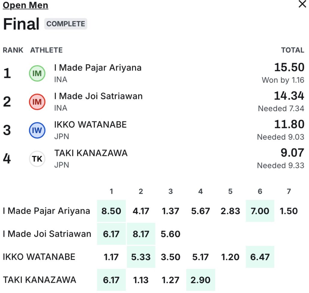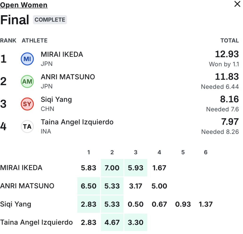 注目の日本人選手たちの活躍は、池田美来が優勝、松野杏莉が準優勝と日本代表選手がワンツー・フィニッシュを決め、オープンメンズでは渡邉壱孔が3位、金沢太規が4位入賞、そしてセミファイナルで3位敗退となった足立海世が同率5位と、素晴らしい結果を残した。