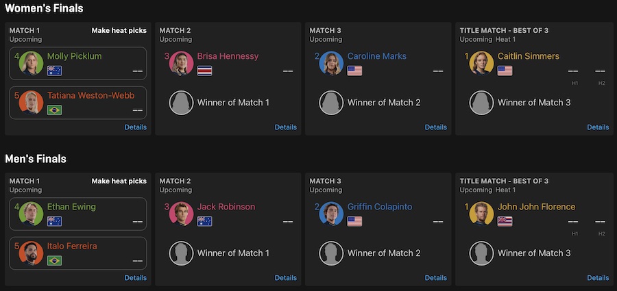 最終CTランキング1位の選手が待ち受けるファイナル・ラウンドは最高で3ヒート行なわれ、2勝を先取した選手がワールドタイトルを獲得することとなる。