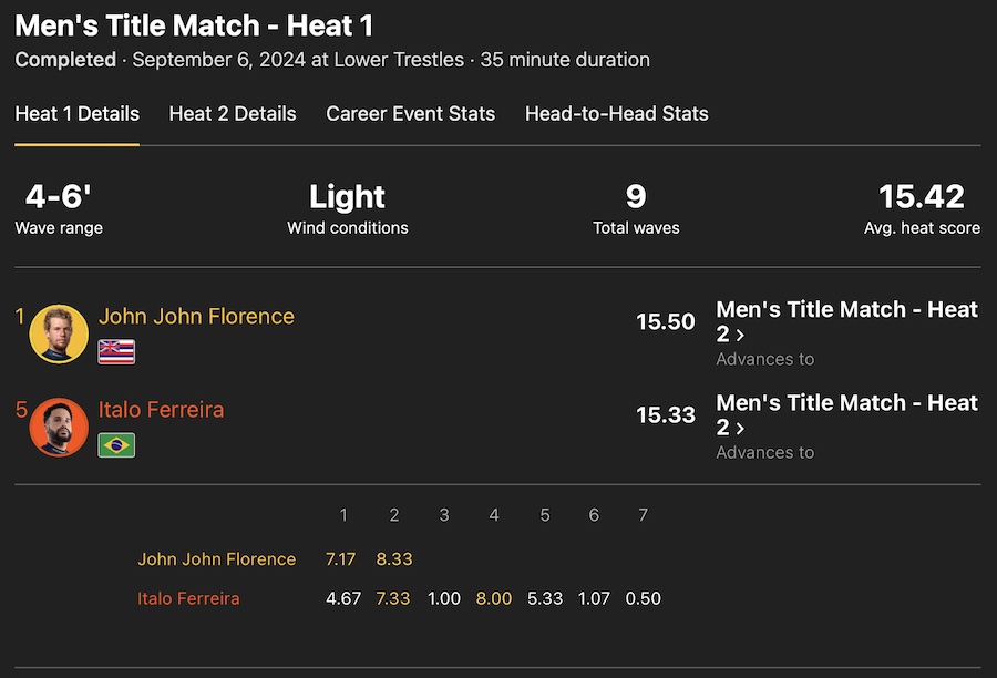 タイトルマッチはJohn John Flroenceと、ラウンド1となるマッチ1からここまで勝ち上がってきたItalo Ferreiraによる戦い。
