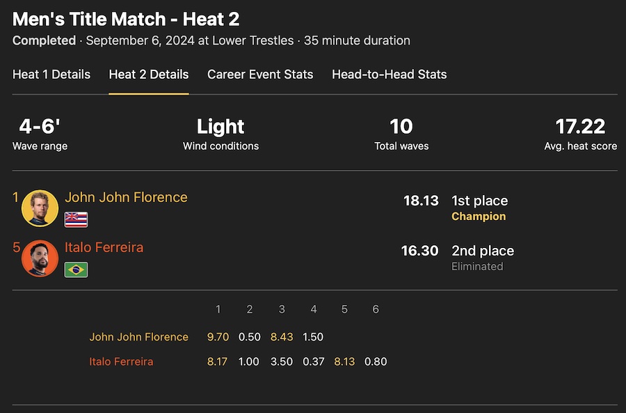 それが功を奏してレギュラーのセットをテンポよく掴み、エクセレントスコアを連発したJohn John Florenceが、ストレート2勝先取で3度目のワールドタイトルを獲得した!