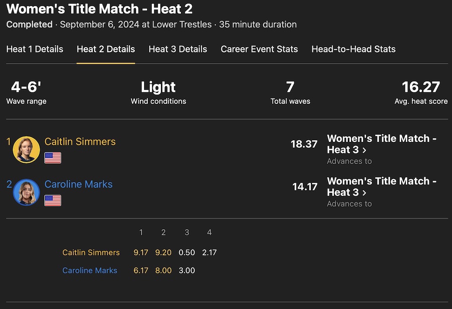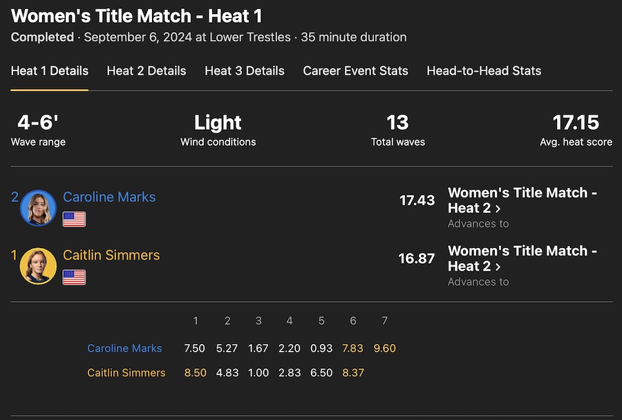 ヒート1では最後の終了8秒前に掴んだ波でCaroline Marksのバックサイドがうなり、9.60ptで大逆転を果たす展開となったが、ヒート2ではCaitlin Simmersがテンポよくレギュラーのセットを掴んで9.17pt、9.20ptとエクセレントスコアを2本叩き出し、見事同点一勝一敗となって迎えたヒート3ではCaroline Marksは1本しか波に乗ることができずCaitlin Simmersが3戦2勝先取で自身初となるワールドタイトルを獲得した!