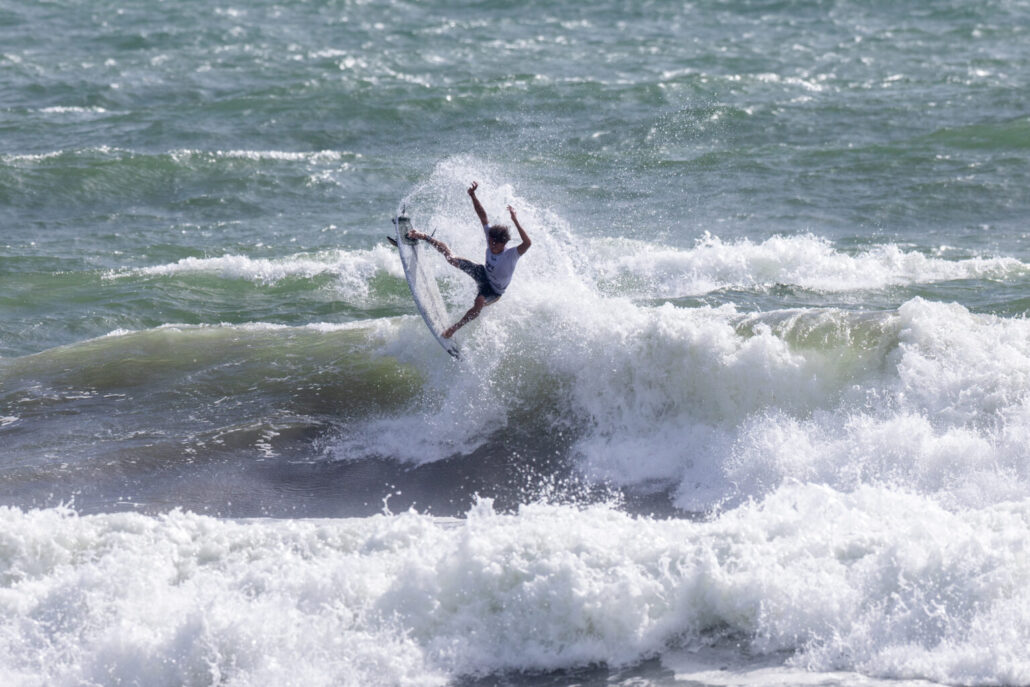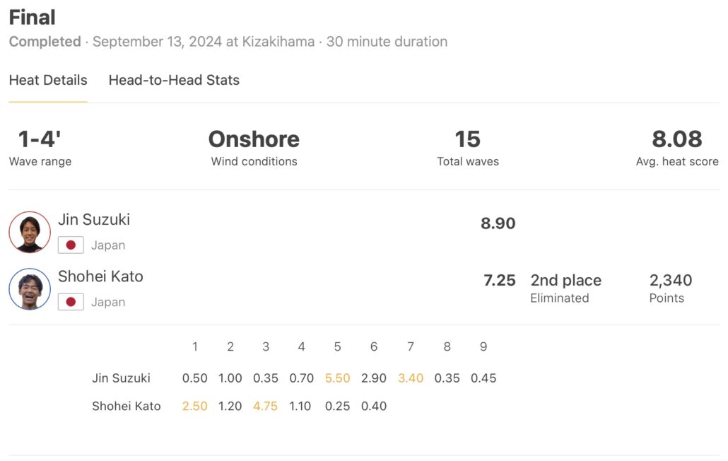 大会初日からキレたサーフィンを魅せていた鈴木仁は、セミファイナルでパリ五輪で5位となった稲葉玲王を相手に質の高いエアリバースで8.0ptのエクセレントスコアを叩き出してファイナルへ進出。線状降水帯による激しい暴風雨の中で加藤翔平との一騎打ちとなったファイナルでも素晴らしいパフォーマンスを披露して優勝を飾った。Jin Suzuki.