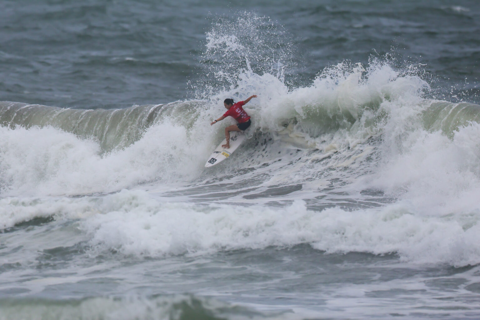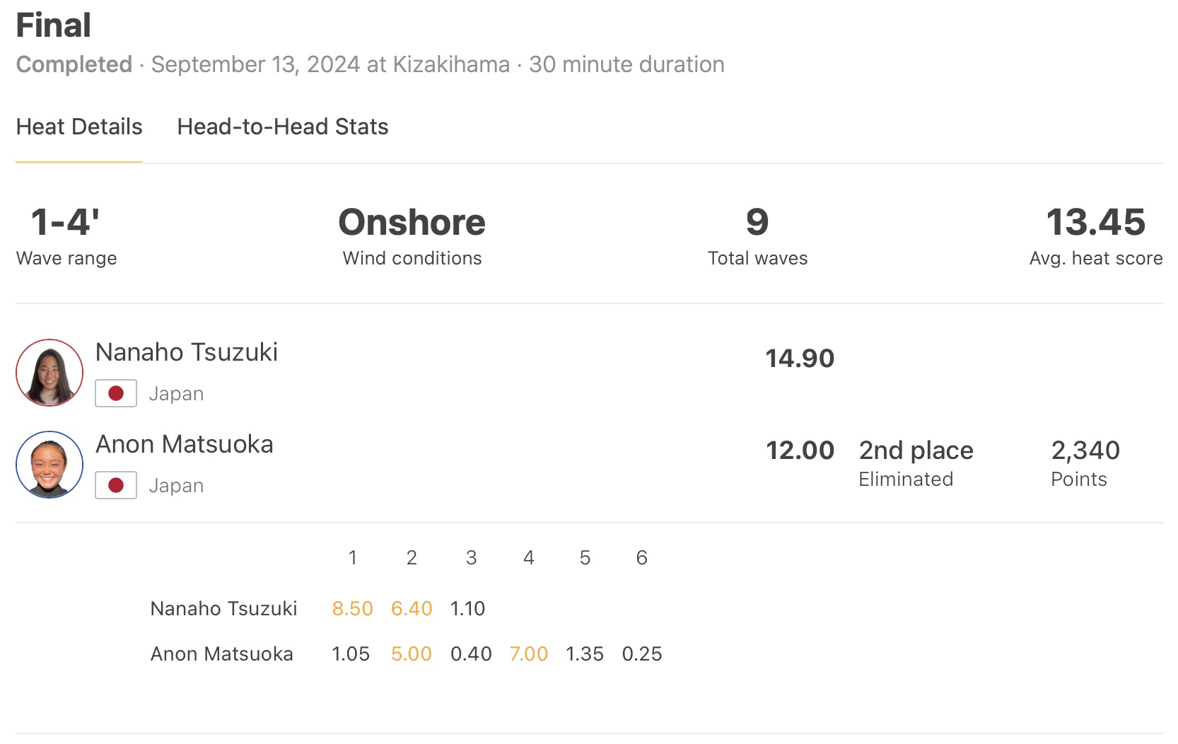 ヒート開始早々に掴んだ1本目の波で強烈なクローズアウトセクションに大きなリッピングをメイクし、8.50ptのエクセレントスコアをマークした都築虹帆。対戦相手となった松岡亜音に逆転される場面でも落ち着いて波を待ち、残り10分を切ったところで6.40ptをバックアップとしてまとめ上げて巻き返し、自身にとって2勝目となるQS優勝を果たした。Nanaho Tsuzuki.