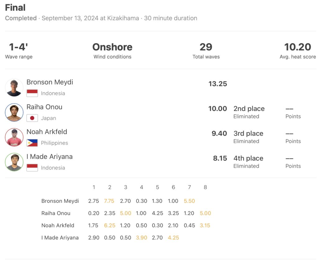 プロジュニアMENSで優勝を果たしたのは、ずば抜けた才能を持つサーファーとして世界中の注目を浴びるインドネシア出身のBronson Maydi。序盤に掴んだ波でソリッドなリップからの崩れ落ちてくるリップセクションに対して縦抜きのテールハイ・エアリバースという意味不明のコンビネーションを決めて7.75ptを叩き出し、会場を興奮の坩堝に陥れたまま、小濃来波、フィリピンのエアリストNoah Arkfeld、インドネシアのI Made Ariyanaに付け入る隙を与えず優勝をさらった。Bronson Maydi.