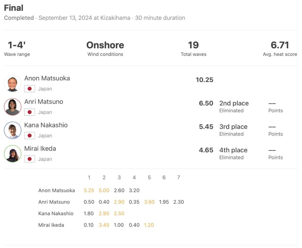 中塩佳那、池田美来、松野杏莉を相手に、ポテンシャルのない波でも世界仕込みの質の高いターンでグッドスコアを次々と重ね、見事ダントツの優勝を飾った松岡亜音。WOMENS QS3000ではファイナルで都築虹帆に敗退となり、W優勝とまではならなかったが、その可能性を十分秘めていた。9/17(水)からお倉ケ浜でスタート予定のQS3000″IBK日向プロ”での快進撃にも期待がかかる!
