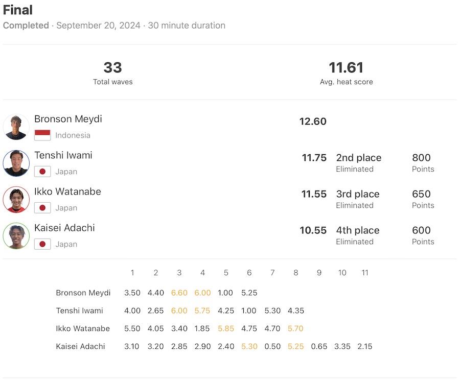 スピードと技のキレ味、ボードが足に吸い付いているかのような安定感、ネクストレベルなボードコントロールと、パワーを除けば各国を代表するプロ選手の中でもずば抜けたスキルを持ちながらもQS3000では波を掴めずまさかの敗退。その雪辱を晴らすかの如く今大会でもプロジュニアを制したのはインドネシアが生んだ次世代注目株Bronson Maydiとなった。木崎浜での宮崎プロに続いてプロジュニア戦2連覇を果たした。MENS Pro Junior winner, Bronson Maydi.