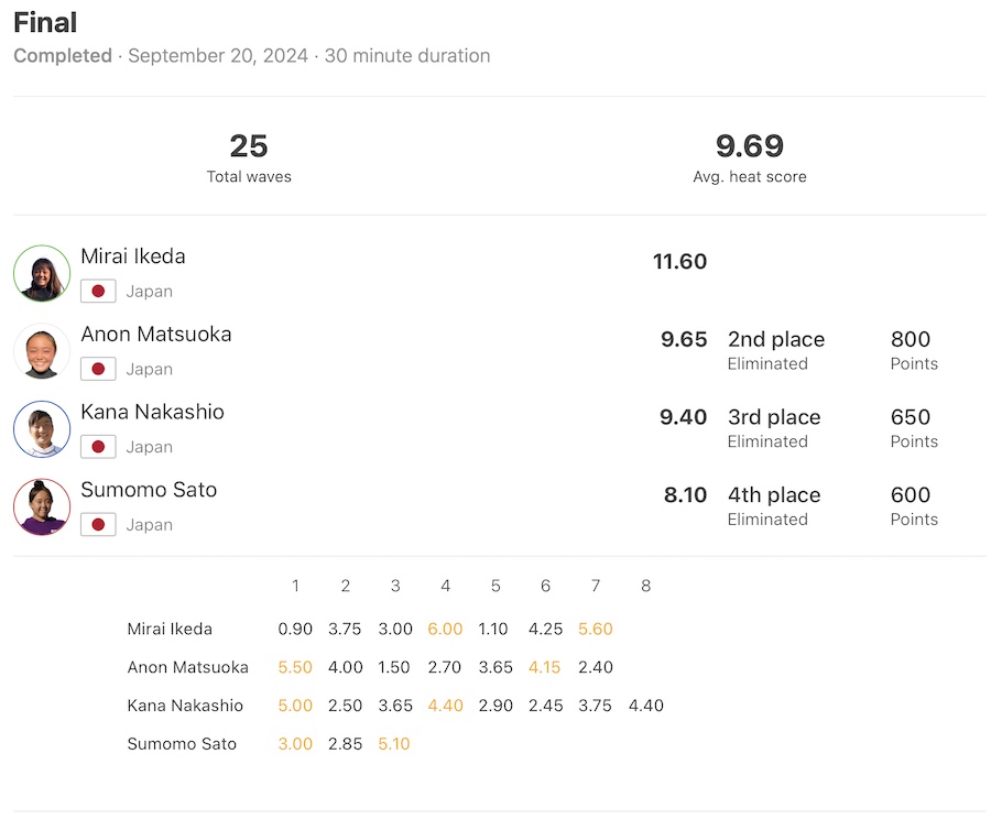 どんな状況でも冷静を保ち、着実にスコアを出してくるそのメンタルの強さ。7本目に掴んだ波で5.60ptを叩き出し、バックアップを塗り替えて逆転優勝を果たした池田美来。WOMENS Pro Junior winner, Mirai Ikeda.