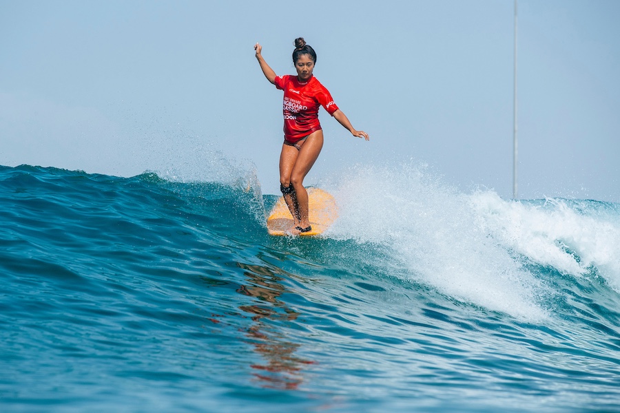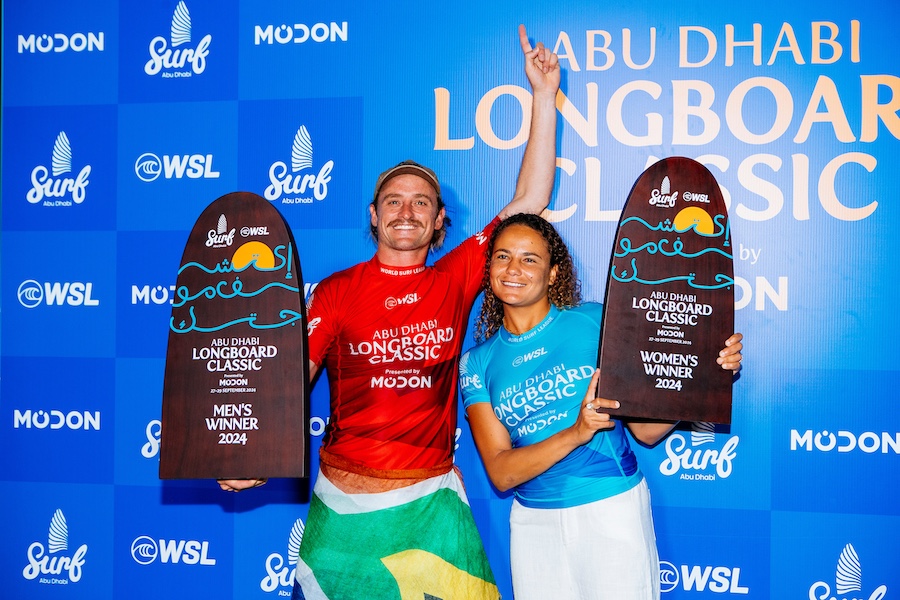 HUDAYRIAT ISLAND, ABU DHABI, UNITED ARAB EMIRATES – SEPTEMBER 29: Natsumi Taoka of Japan surfs in Heat 4 of the Quarterfinals at the Abu Dhabi Longboard Classic on September 29, 2024 at Hudayriat Island, Abu Dhabi, United Arab Emirates. (Photo by Damien Poullenot/World Surf League)HUDAYRIAT ISLAND, ABU DHABI, UNITED ARAB EMIRATES – SEPTEMBER 29: WSL Longboard Champion Steven Sawyer of South Africa and Alice Lemoigne of France Winner of the Abu Dhabi Longboard Classic on September 29, 2024 at Hudayriat Island, Abu Dhabi, United Arab Emirates. (Photo by Damien Poullenot/World Surf League)
