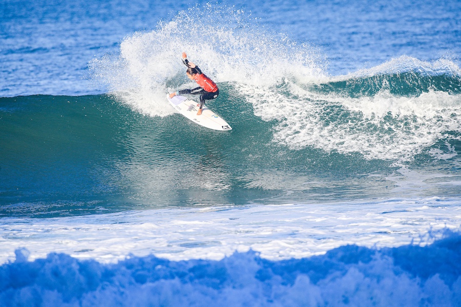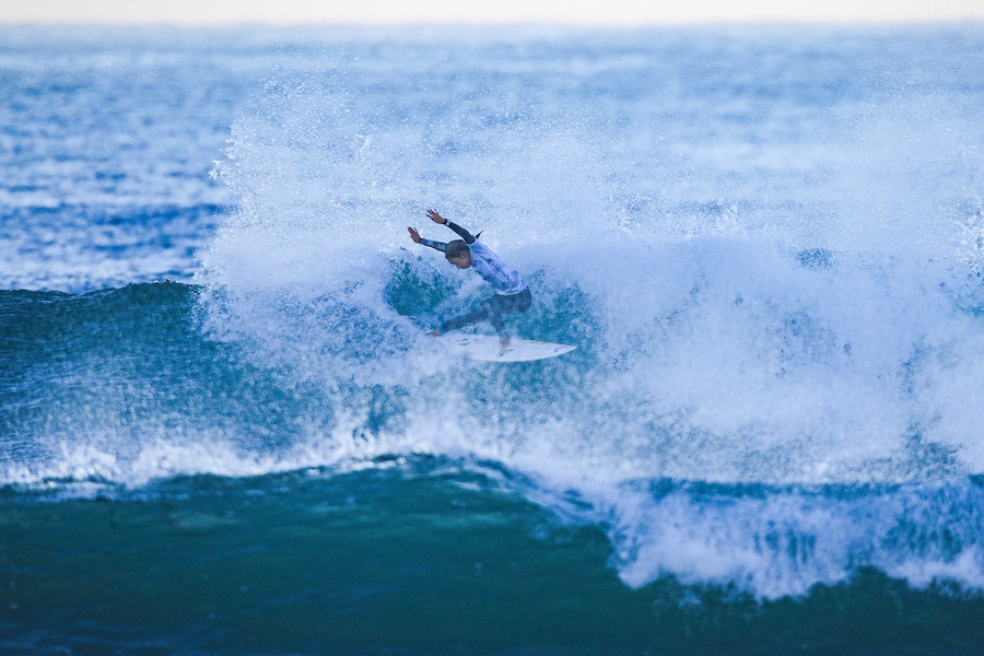 RIBEIRA D’ILHAS, ERICEIRA, PORTUGAL – SEPTEMBER 29: Amuro Tsuzuki of Japan surfs in Heat 4 of the Opening Round at the EDP Ericeira Pro on September 29, 2024 at Ribeira D’Ilhas, Ericeira, Portugal. (Photo by Laurent Masurel/World Surf League).世界に評価されるパワフルなターンでこの日のハイエスト・シングルスコアとなる7.33ptをマークしてラウンドアップを果たした都筑有夢路。
