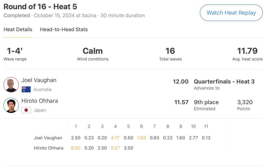 ラウンドオブ16で大原洋人を0.43pt差で下したJoel VauVaughanをはじめ、David Silva、Kade Matson、Marco Mignot、George Pitter、Miguel PupoがMENSで、WOMENSではErin Brooks、Sally Fitzgibbons、Bella Kenworthy、Isabella Nicholsが現時点で2025年CT出場権を獲得した。