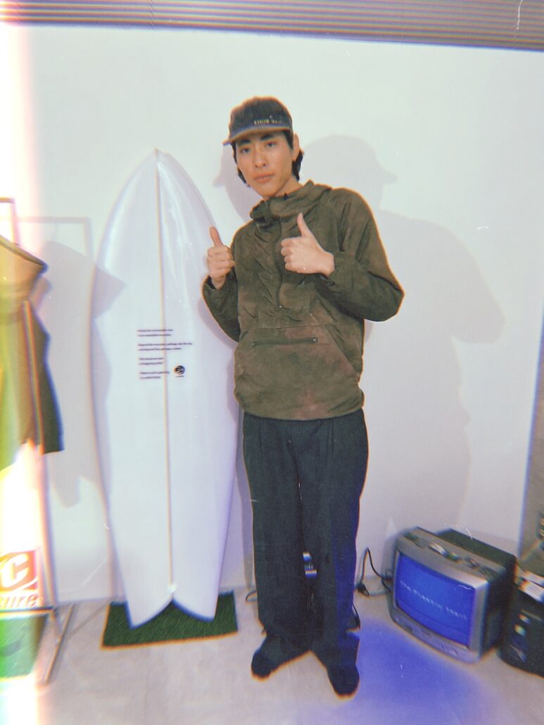 そんな彼が、同じ茅ヶ崎出身のプロサーファー田中透生の兄であり、ここ数年若い世代の間で”画質がエモい”と注目を浴びるDVテープ映像が流行る数年前からDVテープを使ったサーフムービーを作成してcolorsmagに送ってきてくれるなど、周りの一歩先を行く確かな感性を持つムービークリエイターの田中美龍が都内に構えたアートギャラリー的サーフショップ”The Plastic Mail”を会場に、初となるアート展&上映会”Alreadynaked”を開催した。